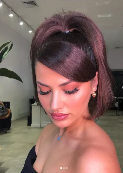 This vintage-inspired ponytail is making a stylish comeback. Leave a thick section of hair at the front to sweep gently to the side, then pull the rest of your hair into a high ponytail. Use a straightening iron to flip the ends outward for that playful, retro finish.