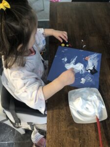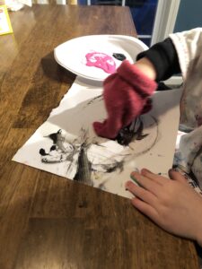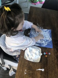 Ask how it feels on their hand and encourage them to explore the different patterns they can create on the paper. It’s a fun and sensory-rich way to paint.