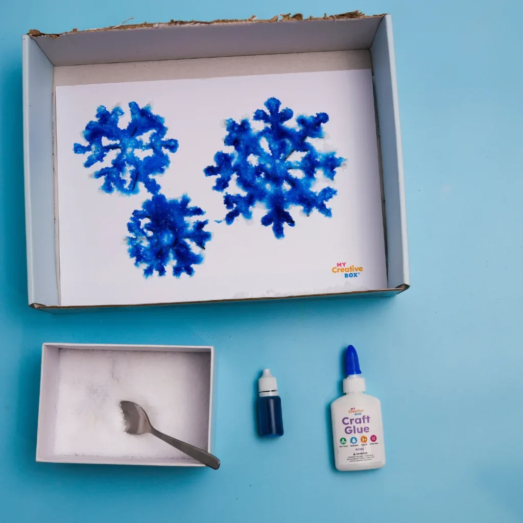 Place the snowflake template in your tray. Trace each snowflake with PVA glue, then sprinkle salt over the glue lines. Gently shake the tray to remove any extra salt.