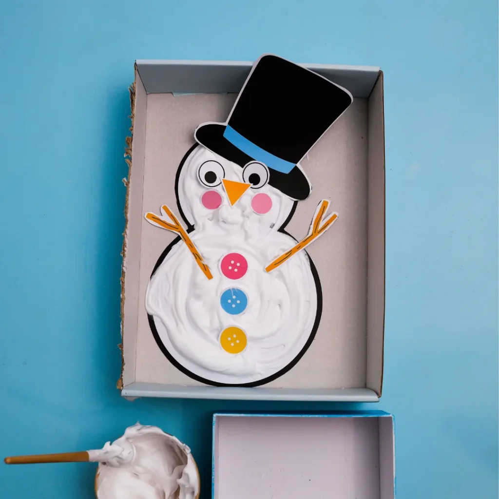 You’ll need: Snowman template, shaving cream, bowl and spoon, PVA glue, scissors (adults can help cut the snowman parts), paintbrush.