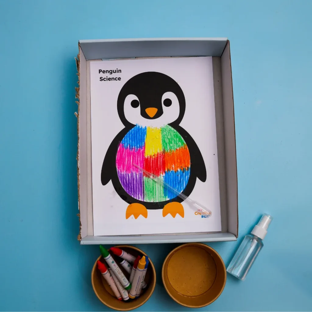 You’ll need: Penguin template, wax crayons or pastels, pipette, PVA glue, paint palette, paintbrushes, glitter, or other craft materials.