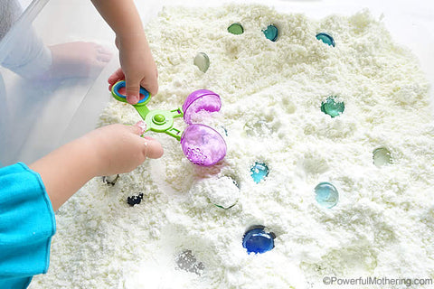 This homemade snow dough looks just like freshly fallen snow and is perfect for keeping little fingers busy indoors. The best part is that it’s taste-safe, so curious toddlers can explore without worry.
