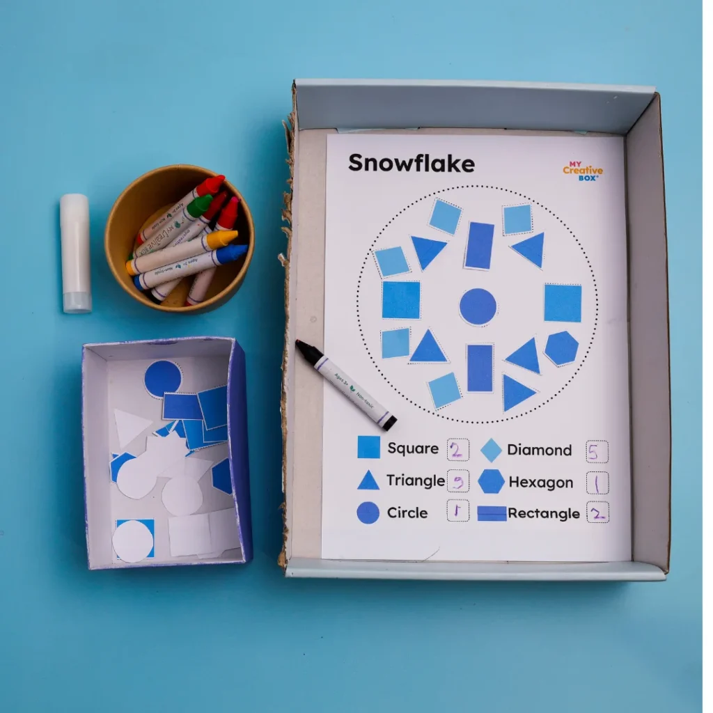 You’ll need: Snowflake template, crayons, glue stick, scissors (an adult may need to help cut out the shapes).
