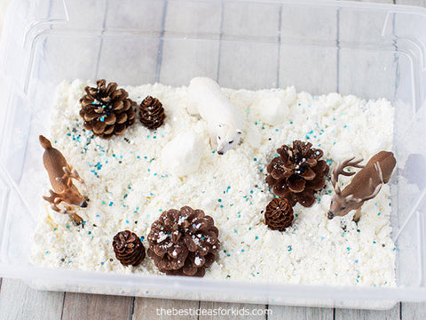 Collect a few pinecones from outside and combine them with a few simple kitchen ingredients to make a sensory box that feels like real snow.