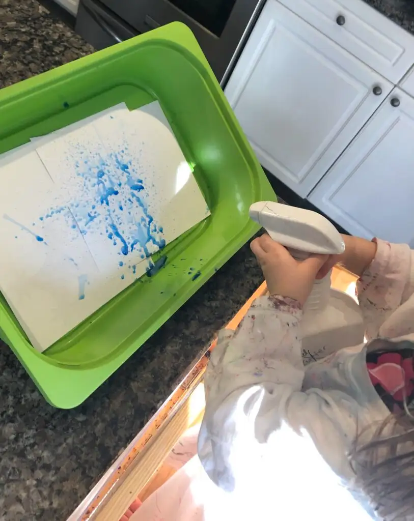 Let your child help so they can see and talk about how it turned out. This activity is one of my favorites because it mixes several learning moments together, and every child loves using a spray bottle. It’s also great for fine motor skills.
