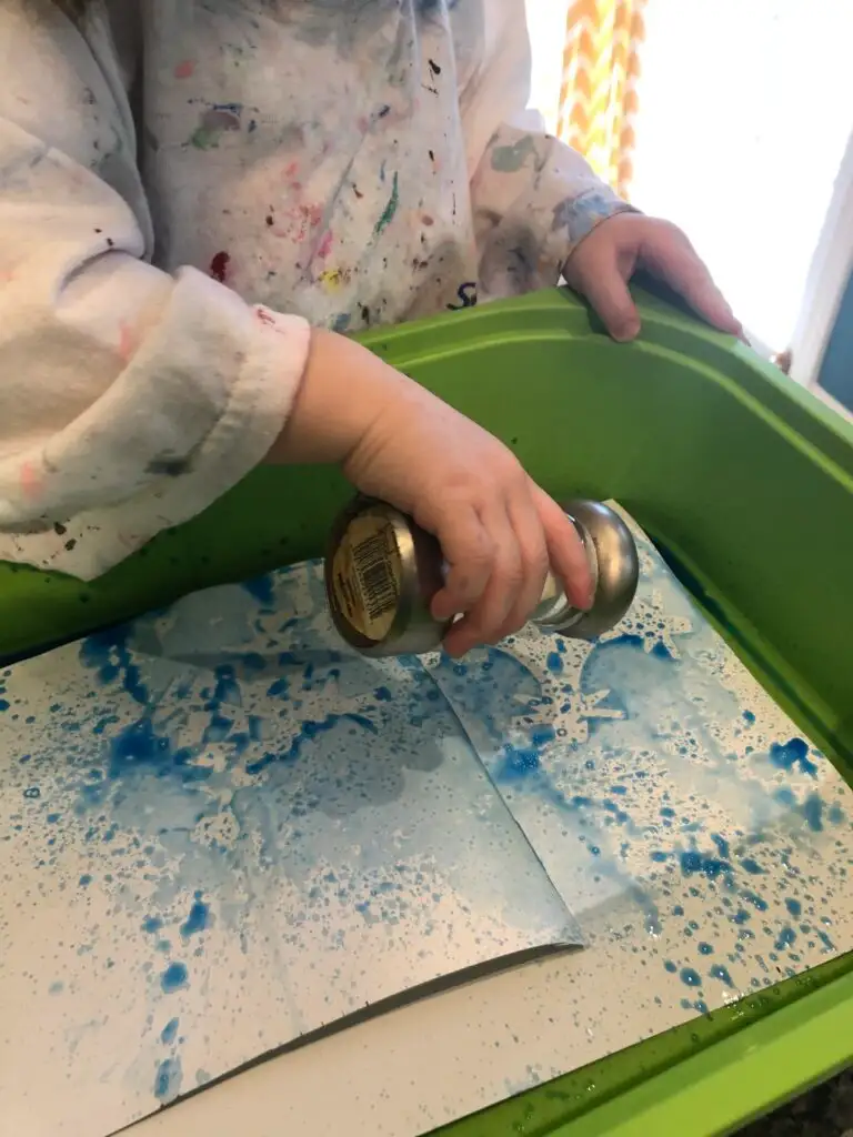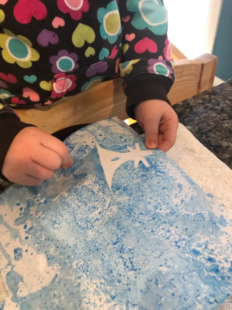 Have your child spray the paint onto their paper inside a bin to catch the splatter. You can sprinkle a bit of salt on top to see how it changes the paint as it dries. When it’s dry, peel off the contact paper and brush away the salt.