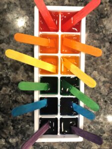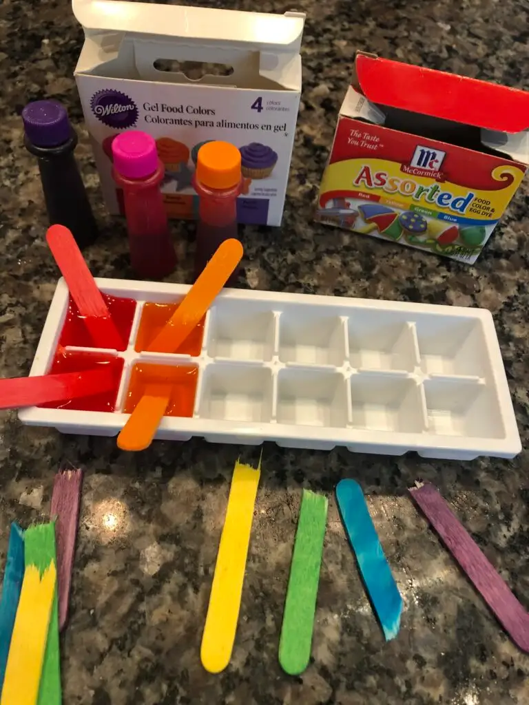Supplies: Ice cube tray, water, food coloring, craft sticks, paper.