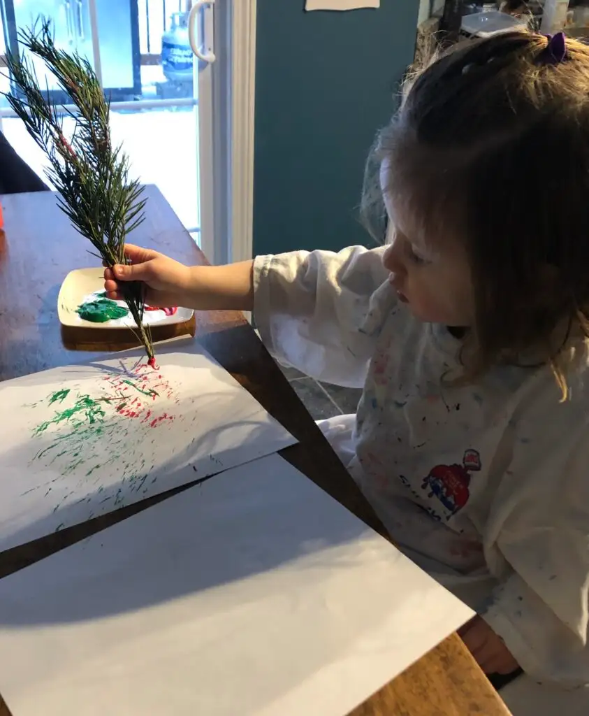 If you have leftover trimmings from your Christmas tree or wreath, this is the perfect way to reuse them. If not, head outside together and find a few small branches to trim.