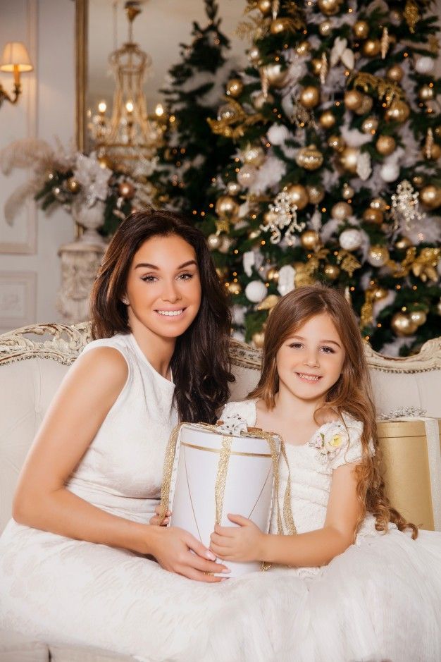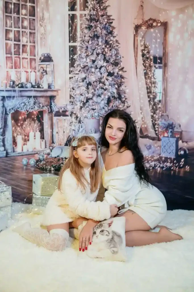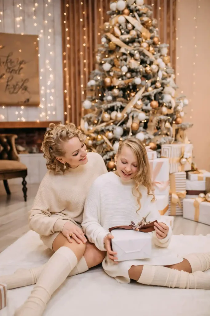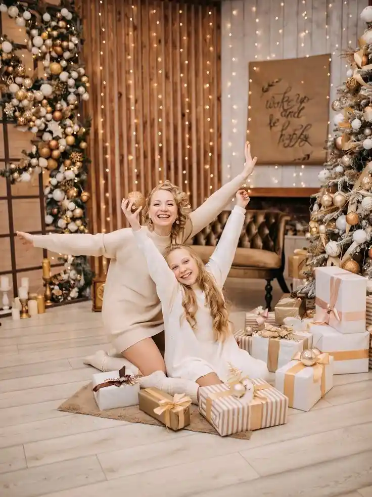 This timeless setup captures the heart of the season with soft white tones, a glowing tree, and a touch of gold shimmer. A mother and daughter dressed in matching ivory outfits create a dreamy, classic scene. Holding a beautifully wrapped present together makes the photo feel full of warmth, love, and Christmas wonder.