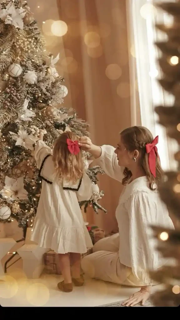 There is nothing sweeter than capturing the moment when a mother and daughter decorate the Christmas tree side by side. Soft golden lighting, matching cream dresses, and delicate red bows create a magical scene that feels warm and full of love. It is a beautiful reminder of how special these simple traditions can be.