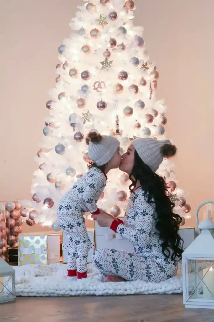 Matching festive pajamas and a frosted tree make this scene feel just like Christmas morning. The gentle kiss and soft winter tones capture that heartwarming moment of love and connection. It is the kind of picture that perfectly sums up what the holidays are all about.