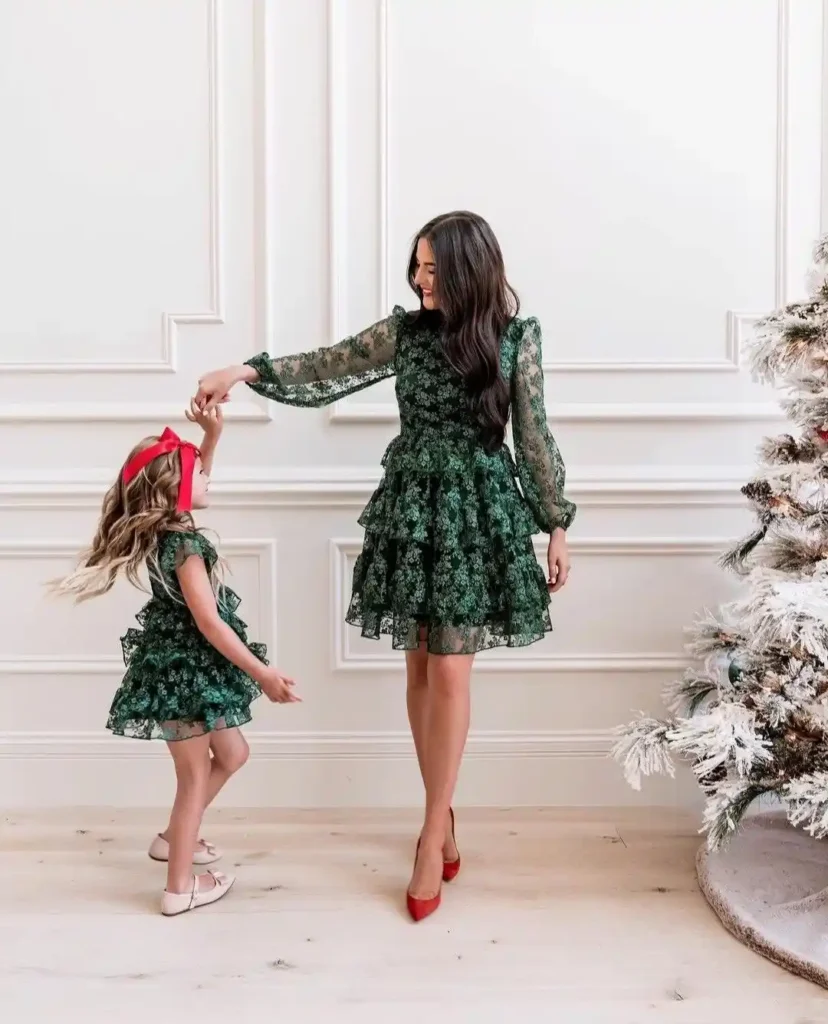 Green lace dresses, red shoes, and joyful smiles make this photoshoot feel like something out of a fairytale. The elegant setting and soft tones create a perfect mix of holiday style and mother-daughter fun. Twirling together adds motion and happiness that shines through every frame.