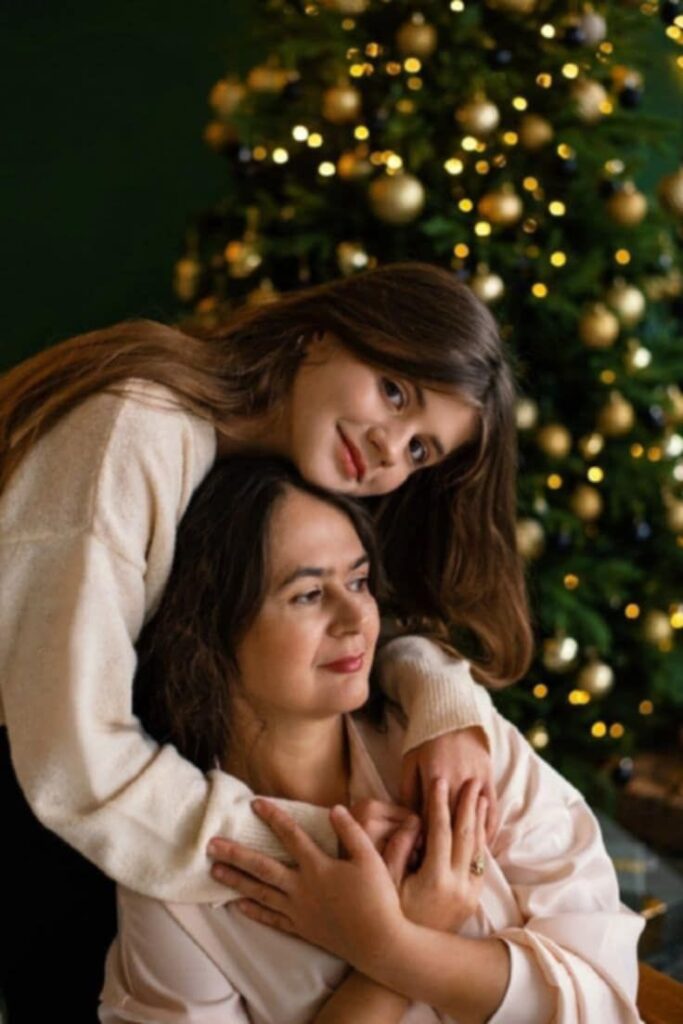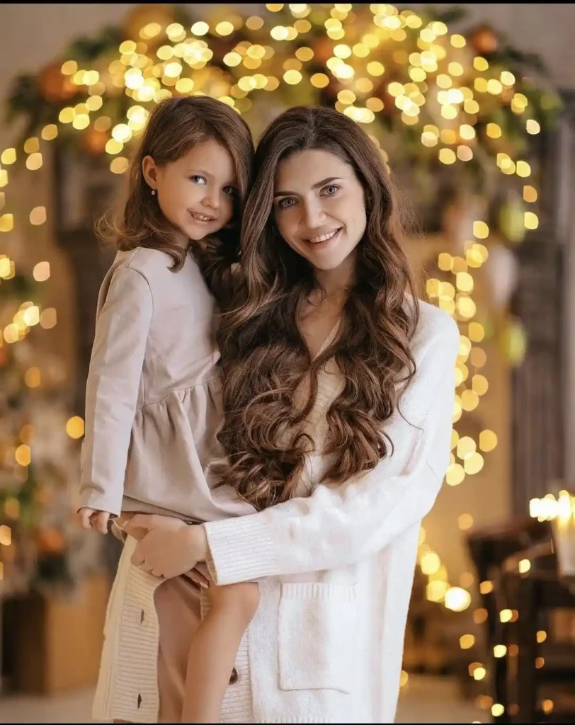 Soft golden lights and gentle smiles make this photo feel warm and full of love. The cozy setting with twinkling bokeh in the background creates the perfect festive glow. Matching neutral outfits keep the focus on the bond and joy shared between mother and daughter.