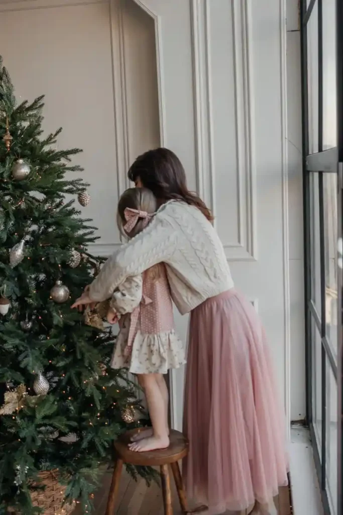 A soft pink skirt and matching bow bring a delicate touch to this mother-daughter moment. Decorating the tree together creates a feeling of teamwork and love, while the pastel tones add a dreamy, graceful charm. It is a perfect idea for a cozy indoor photoshoot filled with warmth.
