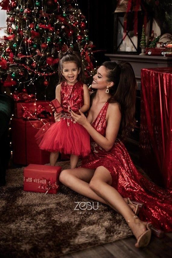 Nothing says Christmas quite like matching red Santa dresses trimmed with soft white fur. This playful and heartwarming moment between mom and daughter captures the pure joy of the holidays. The gentle kiss, festive outfits, and sparkling decor create a photo that feels like a Christmas card come to life.