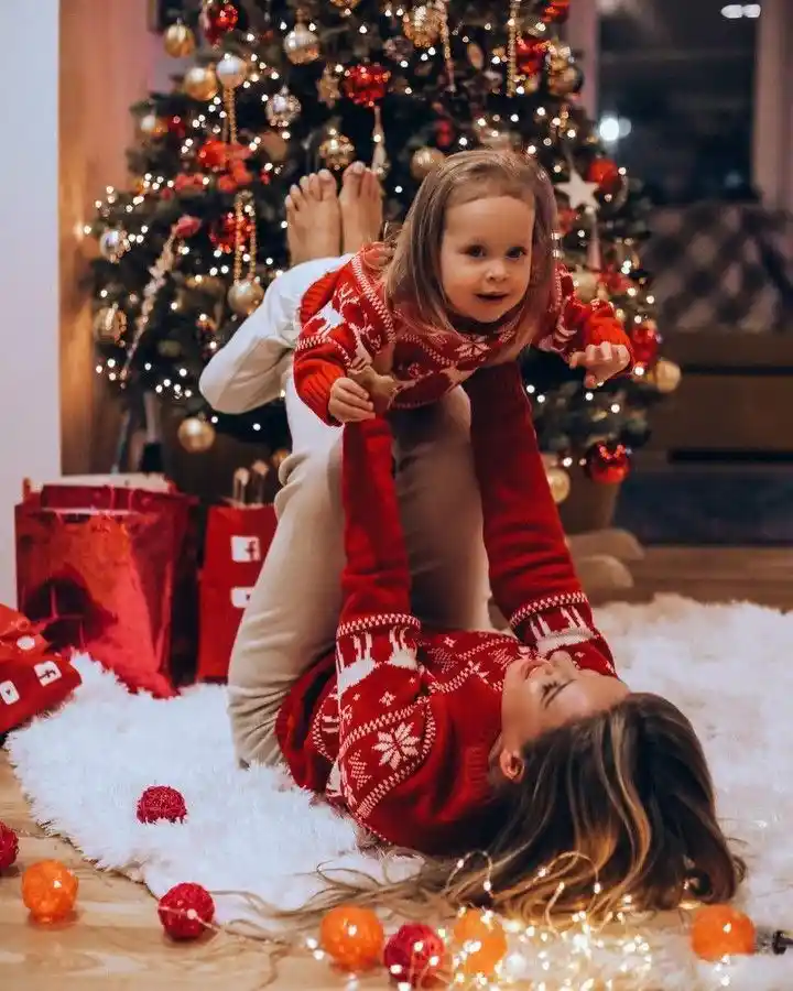 This joyful photo shows the happiness that comes with simply being together. Matching red sweaters, glowing lights, and playful laughter bring the whole scene to life. It captures the fun and carefree spirit of Christmas morning with pure love and connection.