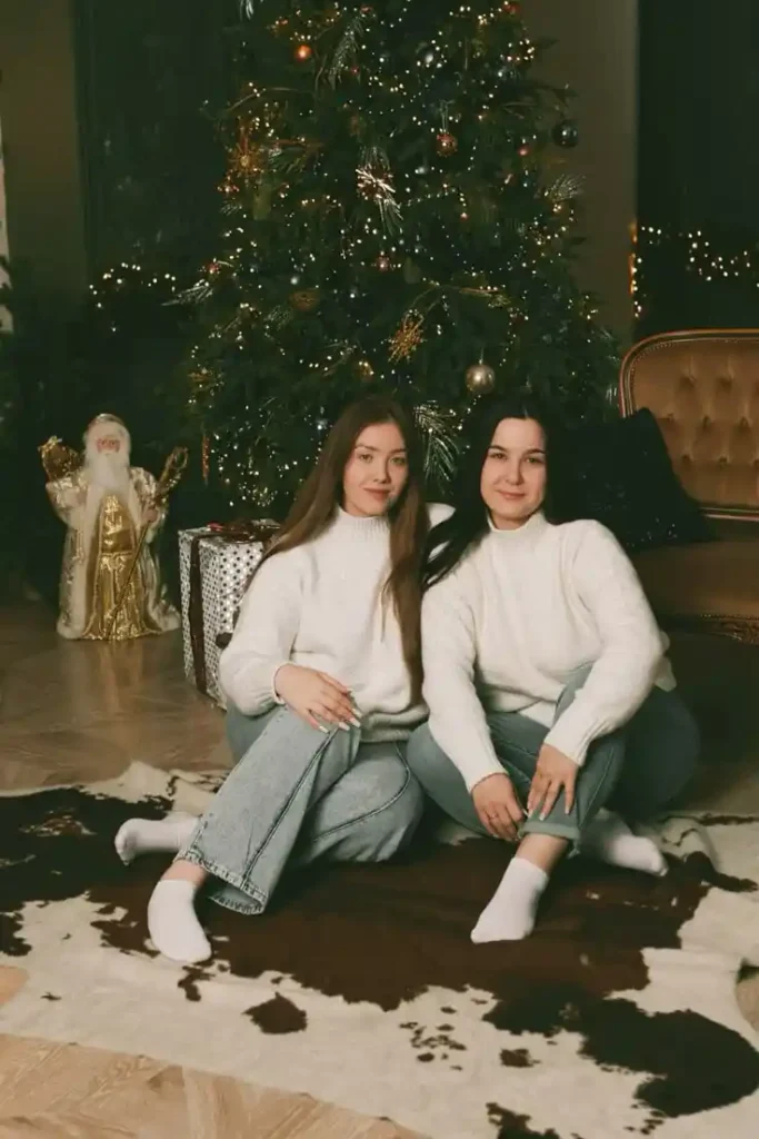 Matching cream sweaters and denim create a look that feels effortlessly warm and timeless. This simple indoor setup with soft lights and a glowing tree captures the beauty of togetherness. It is a relaxed and natural choice for mothers and daughters who want a laid-back holiday photo that still feels elegant and heartfelt.