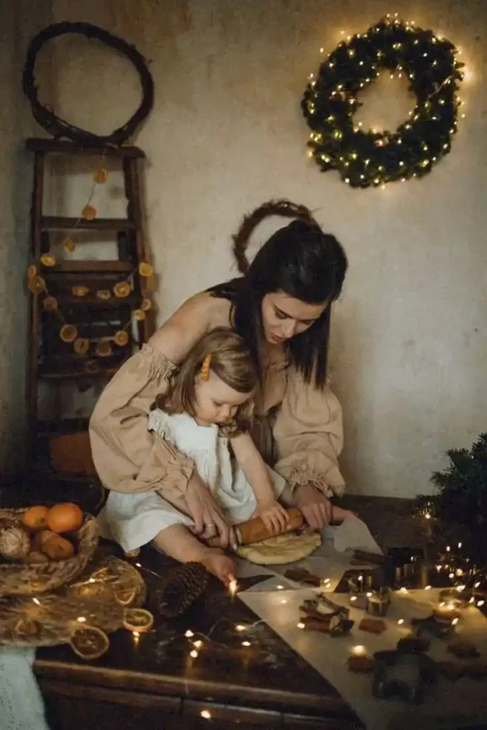 There is something so special about baking together during Christmas time. Rolling out dough, laughing over cookie shapes, and sneaking a few bites make for photos full of warmth and nostalgia. The soft lighting, rustic table, and simple decor add a cozy, homemade charm that feels perfectly festive.
