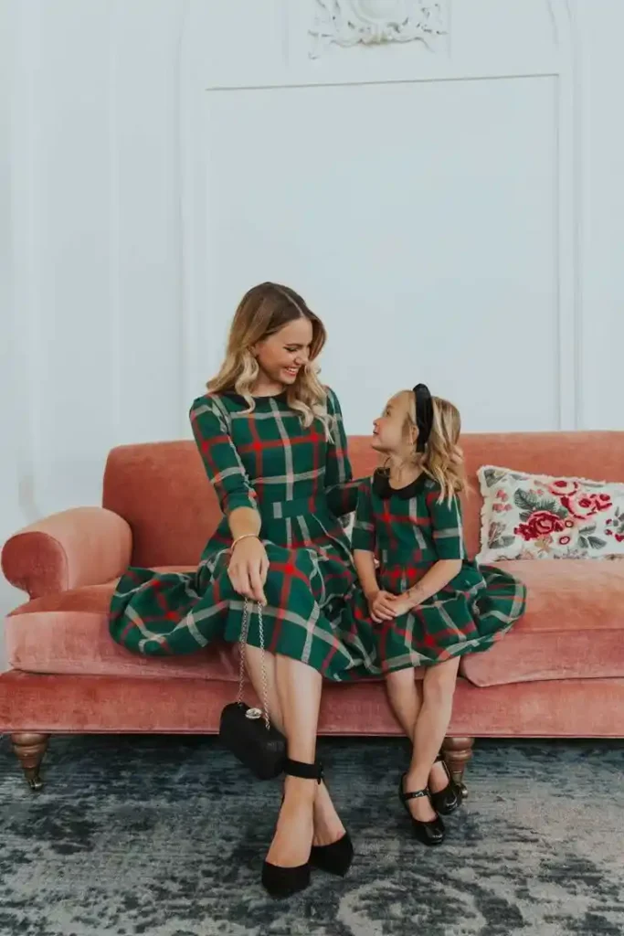 Matching green and red plaid dresses never go out of style for the holidays. This look feels polished yet full of festive spirit. Sitting together on a soft couch with warm smiles creates a beautiful moment that blends vintage Christmas charm with modern elegance.