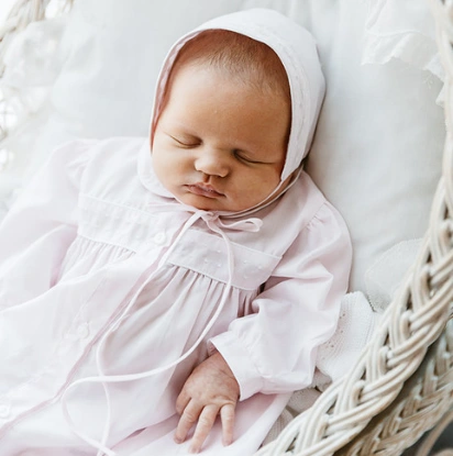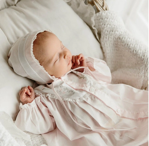 Classic designs such as smocked or bullion gowns remain popular year after year, often paired with delicate matching hats. These soft, vintage-inspired looks photograph beautifully and make those first memories feel extra special.