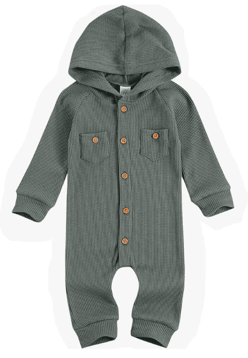 This olive green hooded jumpsuit brings together comfort and style in the sweetest way. The waffle texture fabric is soft, breathable, and stretchy, allowing your baby to move freely. The wooden buttons add a cute, rustic touch, while the hood keeps your little one warm for those first outdoor trips home.