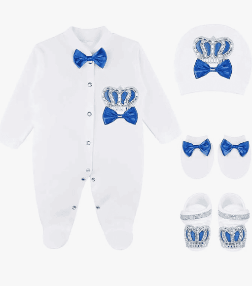 This royal blue and white outfit set is truly fit for a little prince. The sparkling crown detail with matching bows adds an elegant touch to your baby’s coming home look. Complete with a hat, mittens, and soft booties, this set is made from gentle cotton fabric that feels smooth against delicate newborn skin. It’s perfect for making that first day home even more special.