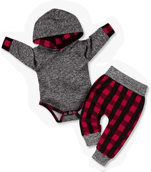 This gray and red plaid hoodie set is cozy, playful, and perfect for your baby boy’s first outing. The soft bodysuit with matching plaid pants gives a cute lumberjack vibe, keeping your newborn both comfy and stylish. It’s a great option for cooler weather and looks adorable in family photos.