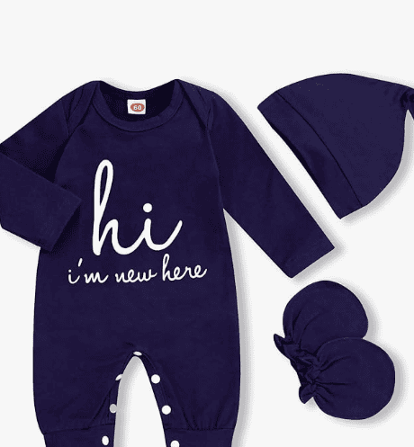 This navy blue “Hi I’m New Here” outfit is such a sweet way to introduce your baby to the world. The soft cotton fabric feels gentle against delicate skin, while the playful print adds a modern touch. The matching hat and mittens complete the look, keeping your little one warm and cozy for that special first ride home.