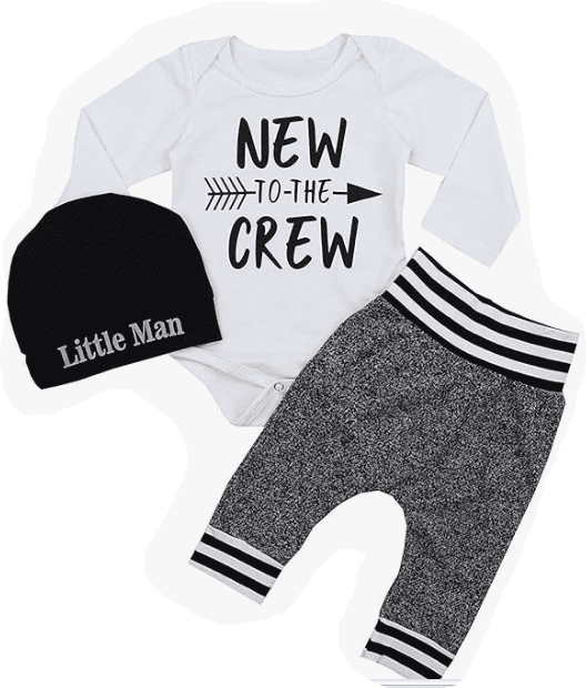 This fun “New to the Crew” outfit set is perfect for your baby boy’s first big debut. The white onesie pairs perfectly with the gray pants and matching hat, featuring the cutest “Little Man” embroidery. The soft, stretchy fabric keeps your baby comfortable and stylish, making this set great for photos and family introductions.