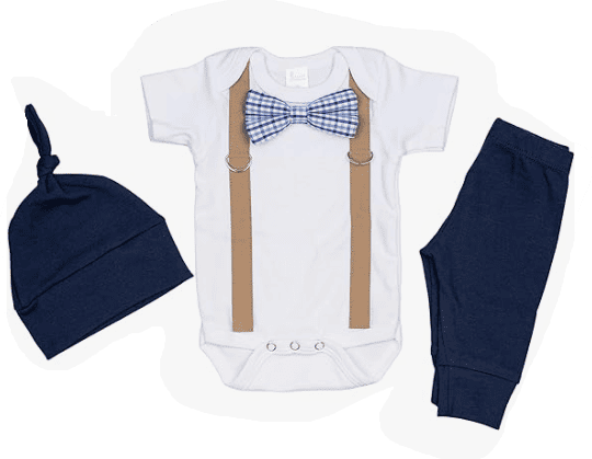 This adorable outfit gives classic charm with a modern twist. The white onesie features built-in suspenders and a blue plaid bow tie for a dressed-up yet comfy look. Paired with navy pants and a matching hat, this set is perfect for a baby boy’s homecoming, family gatherings, or even milestone pictures.