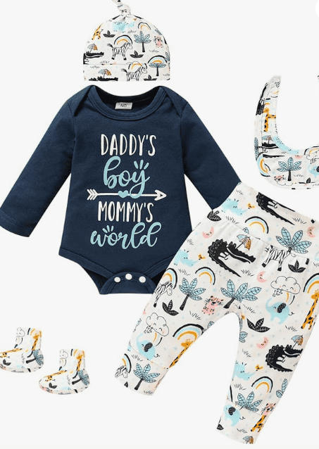This cute “Daddy’s Boy, Mommy’s World” outfit is full of love and personality. The navy bodysuit pairs with soft printed pants, a matching hat, bib, and booties that tie the look together. The cheerful print adds a playful vibe, making it an adorable choice for welcoming your little one home in comfort and style.