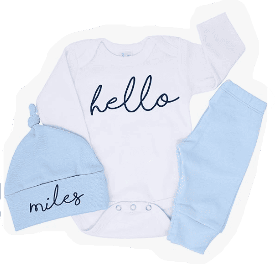 This “Hello” personalized outfit brings a gentle, minimalist charm to your baby’s homecoming. The white bodysuit with navy script pairs beautifully with soft blue pants and a matching hat that can feature your baby’s name. It’s a timeless set that’s perfect for newborn photos and those first cuddly days at home.