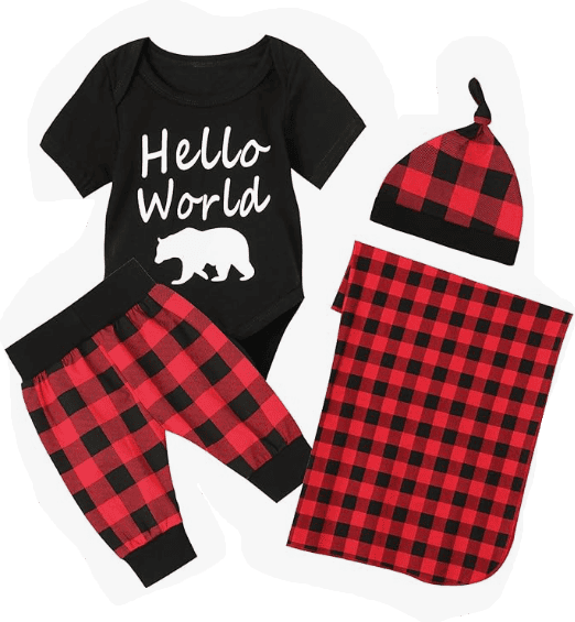 This “Hello World” buffalo plaid outfit is the perfect mix of cozy and cute. The black bodysuit pairs beautifully with red and black plaid pants, matching hat, and a coordinating blanket. The playful bear print adds a fun outdoorsy touch, making it ideal for fall or winter homecomings. Soft, stretchy fabric ensures comfort while the classic colors make for adorable keepsake photos.