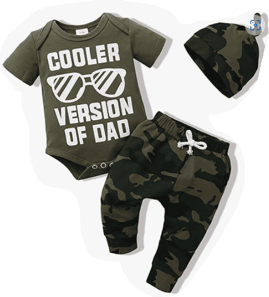 This “Cooler Version of Dad” camo outfit is full of personality and perfect for your baby boy’s first day home. The olive green bodysuit with bold white lettering brings a trendy, playful vibe, while the camo pants and matching hat complete the cool look. Made from soft cotton material, it’s gentle on your baby’s skin and comfy enough for snuggles and naps after that big trip home.