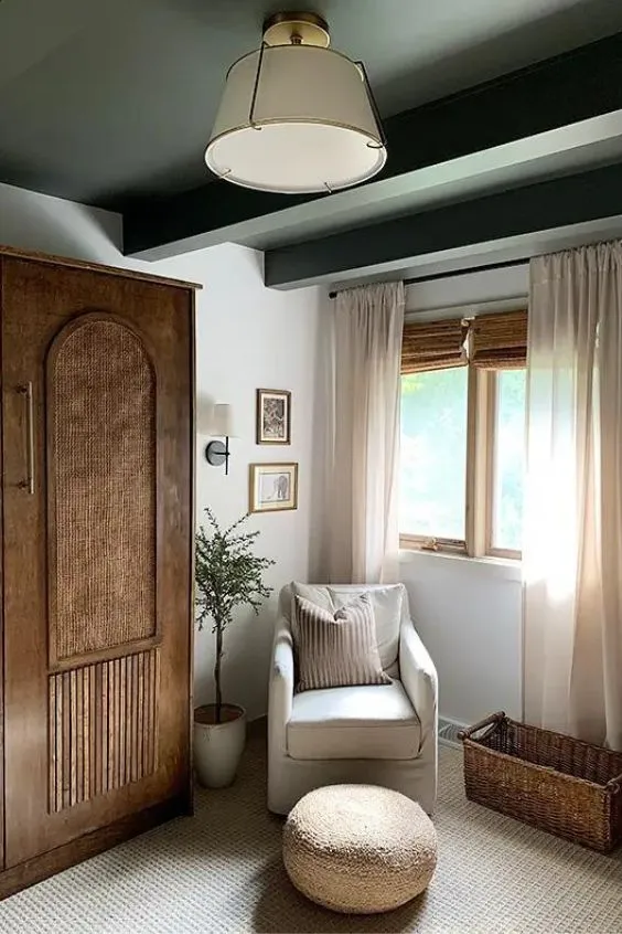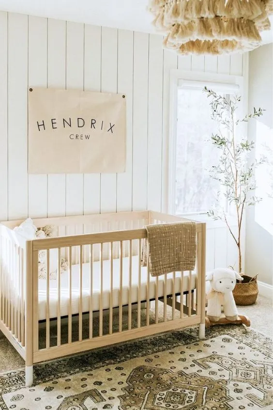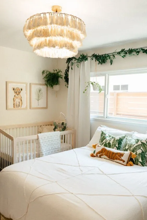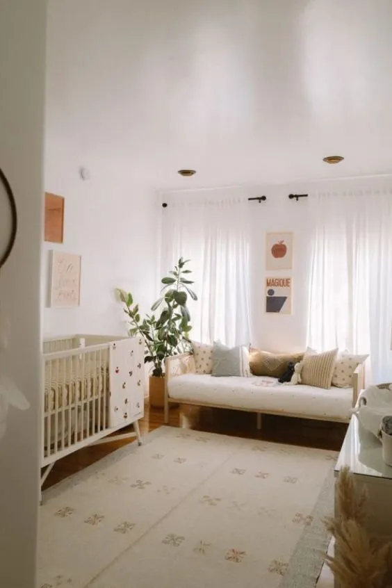 For a warmer take on a white room, cream walls paired with green accents create a cozy, gender-neutral vibe. This combination feels soft and natural, with greenery woven into the decor to add life and playfulness.