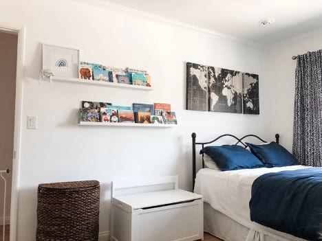 Details like a toy-storage bench and floating shelves keep clutter under control. Bins make it easy to stash laundry and toys, while map art above the bed adds charm that appeals to both guests and little ones.