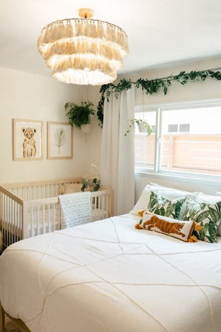A bohemian-inspired space is both fun and stylish for babies and visitors. Picture rainbow wall art, macrame hangings, a chunky throw blanket, and a few potted plants. The look is bright, playful, and cozy.