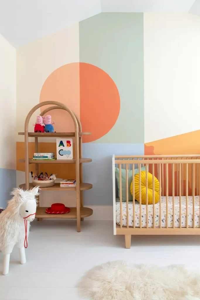 Bring playful energy to the walls with geometric shapes in soft shades of blue, green, and coral. Pairing bold wall art with pale wood tones creates a retro-inspired look that feels modern, colorful, and fun.