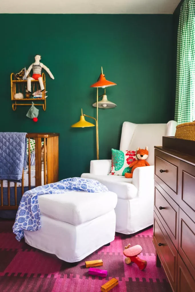 Don’t be afraid to go bold with color. Deep green walls paired with vintage yellow and orange lighting create instant personality. Add checkered curtains and a patterned rug in bright, unexpected shades to turn the nursery into a vibrant and playful retreat.