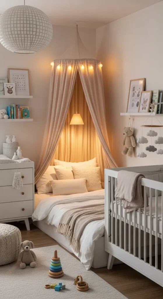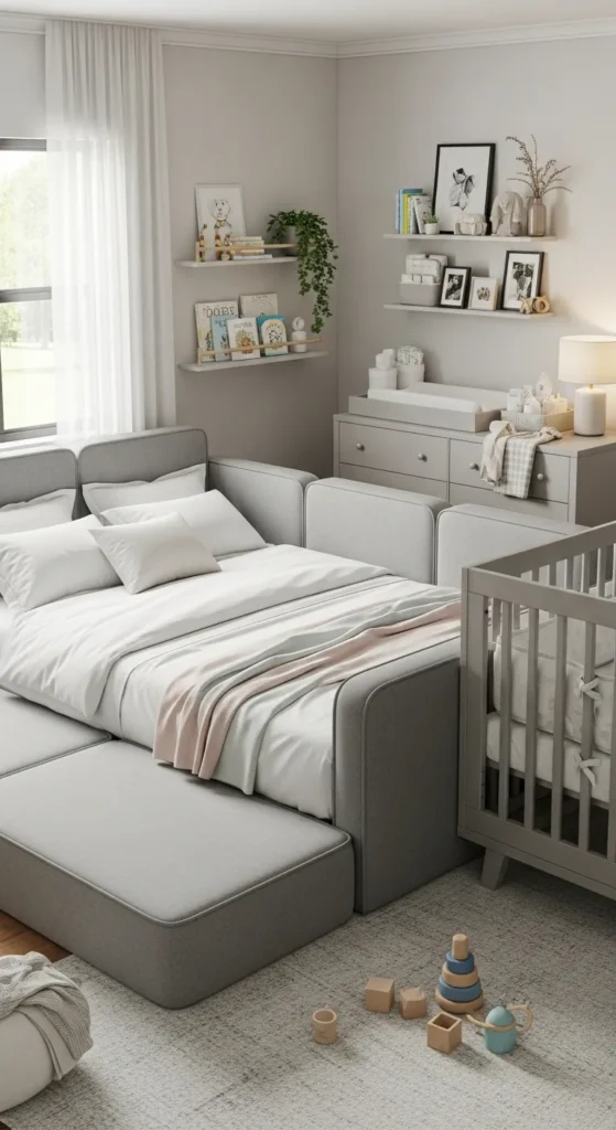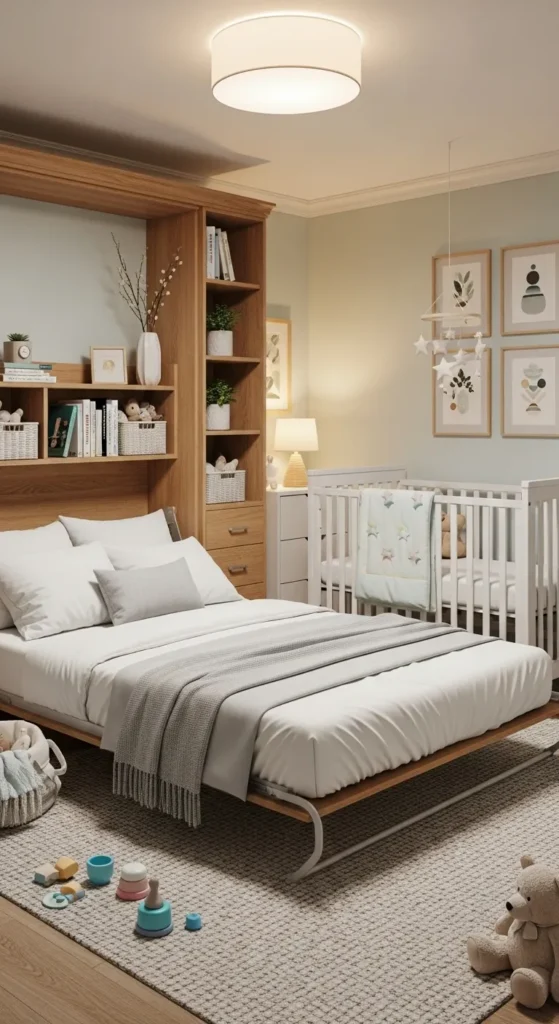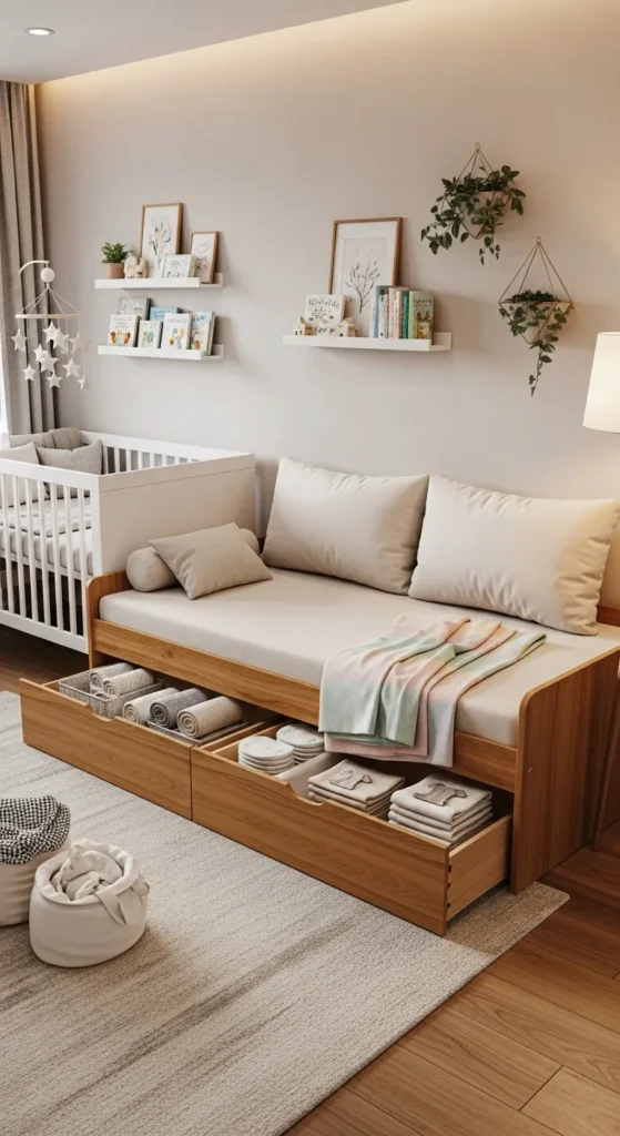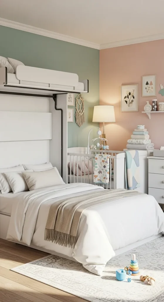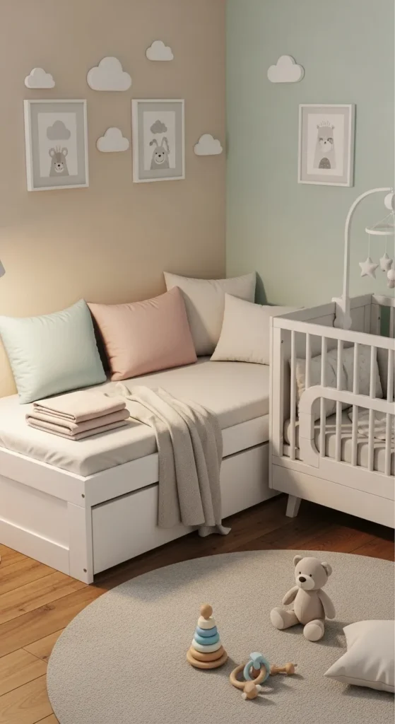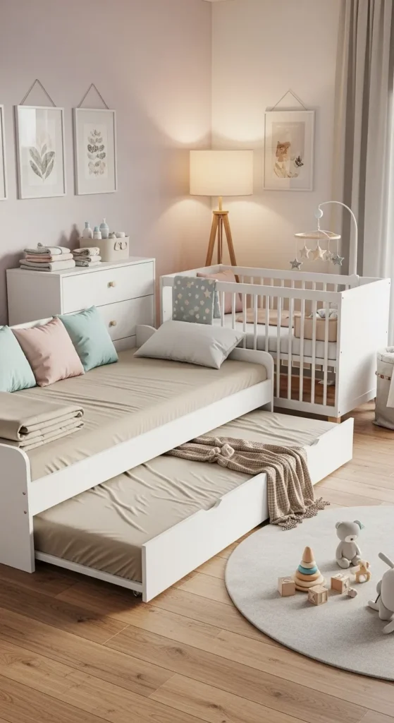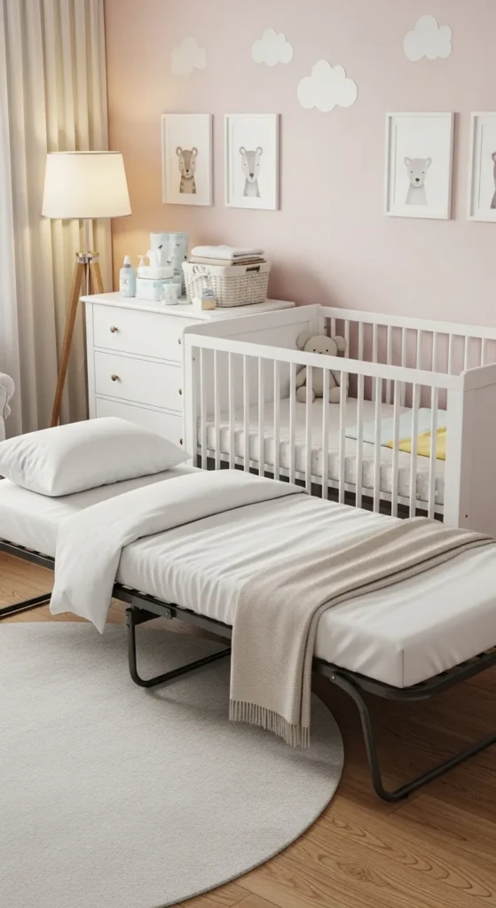 This setup is especially useful in small homes where every inch counts. I’ve seen parents use this idea to keep the nursery clutter-free while still having a real bed on standby.