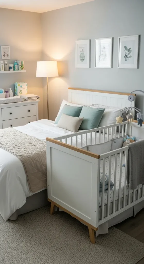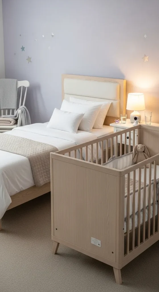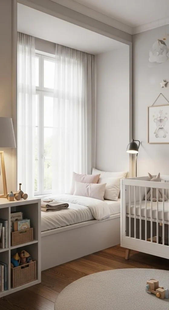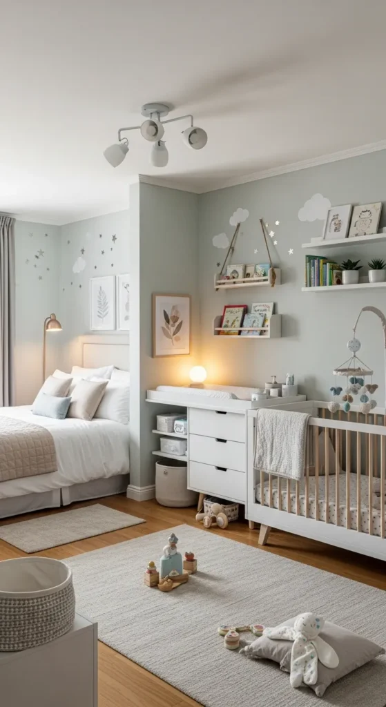 For larger nurseries, you can design a mini-suite style room. This means creating a small alcove or partition where the mom’s bed sits, while the rest of the space stays dedicated to the baby. It feels like two connected rooms in one.