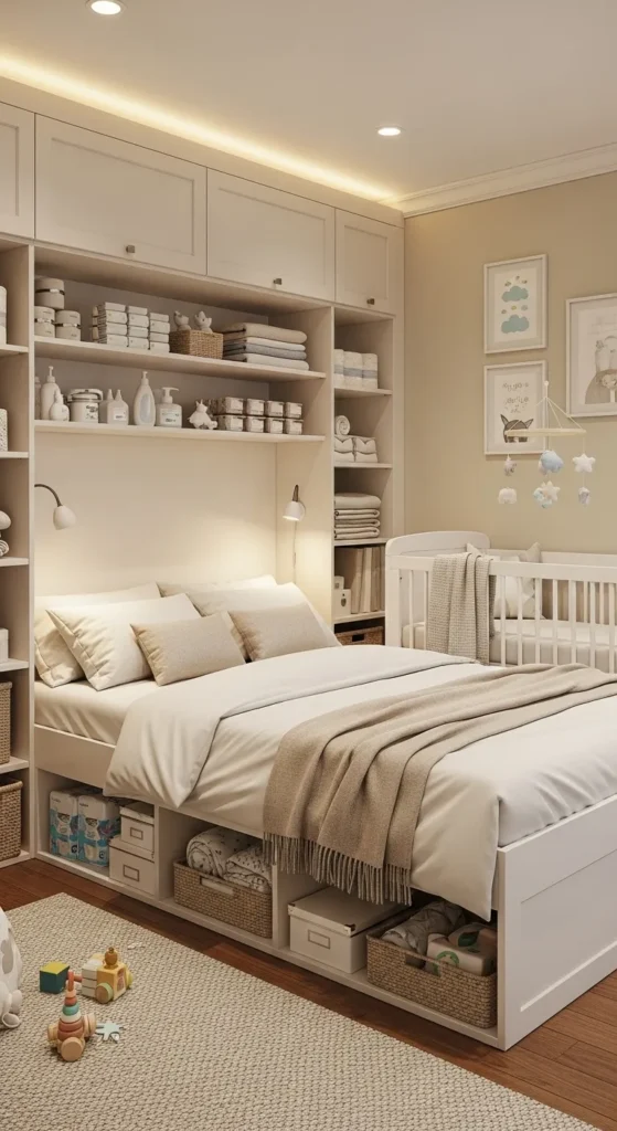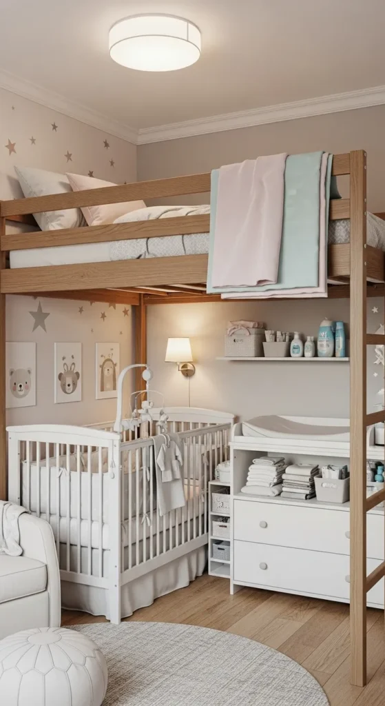 If your nursery has high ceilings, a loft bed is a creative solution. The baby’s crib and storage can be arranged underneath, while mom’s bed is placed on top. It turns one room into a multi-purpose space without feeling overcrowded.