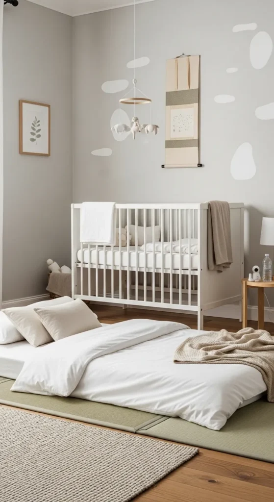 Some parents prefer a floor bed (like a futon or low mattress) in the nursery. It’s minimal, safe, and very cozy. Moms can rest without worrying about falling off a high bed when exhausted, and later, the baby can safely crawl onto it as they grow.