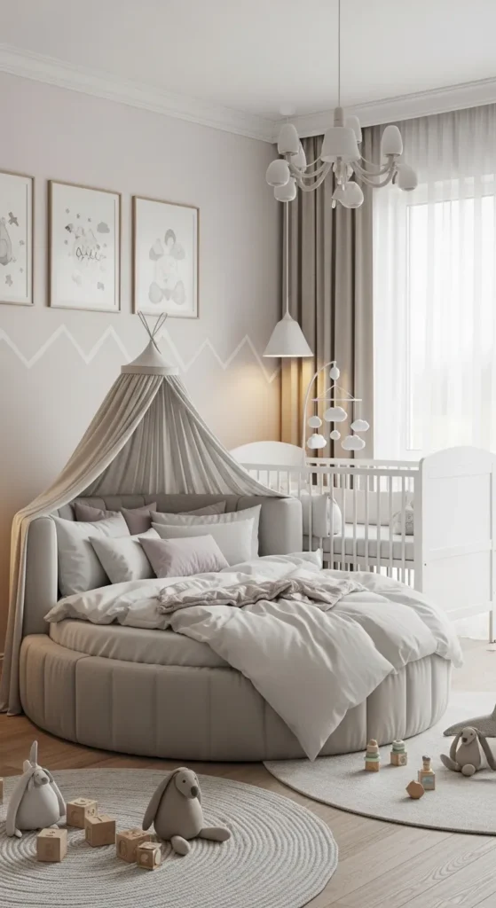 If you want something unique, a round bed works surprisingly well in a nursery. It looks modern and eliminates sharp corners, making the room safer for when your baby starts crawling.