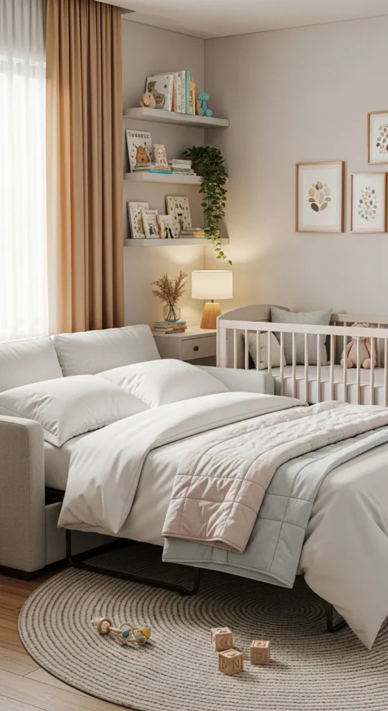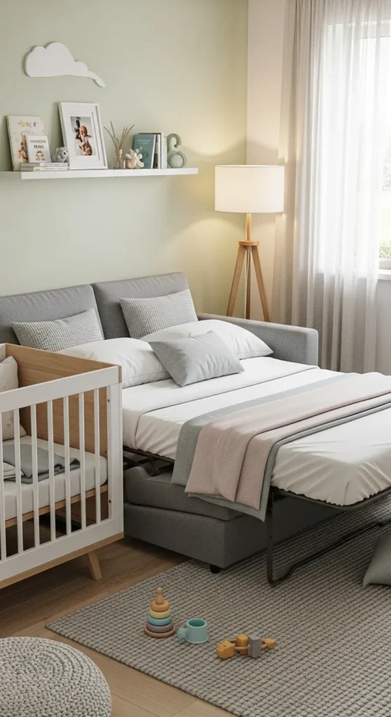 If your nursery doubles as a guest room, a sofa bed is a lifesaver. During the day, it looks neat and gives you extra seating. At night, you can pull it out and sleep comfortably. It’s a flexible solution if you don’t want a permanent bed taking up space.