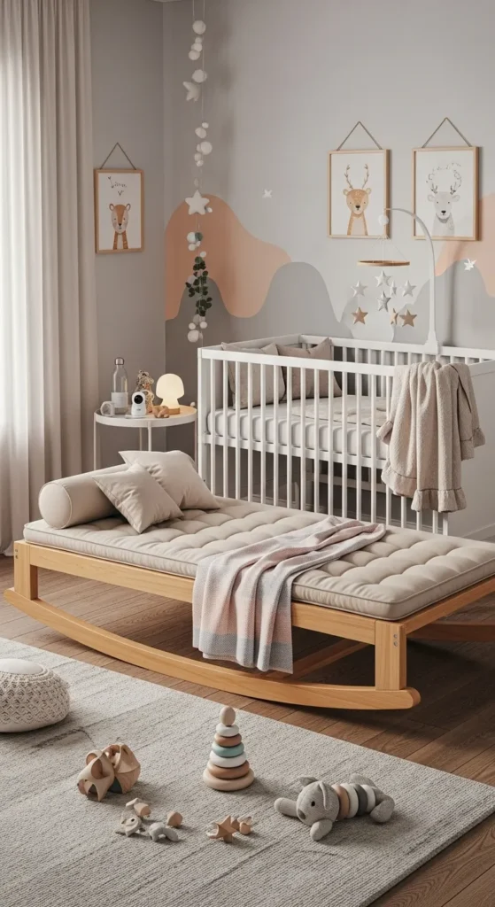 This one feels special: a rocking daybed. It’s not as common as rocking chairs, but they exist and are amazing. Imagine lying down next to your baby while gently rocking both yourself and the crib nearby. It combines relaxation for mom with soothing movement for the baby.