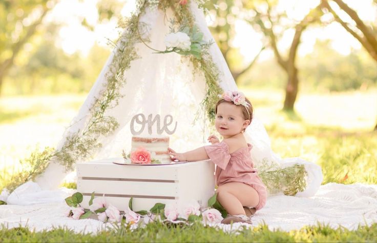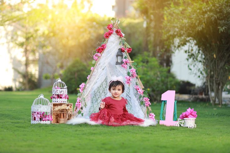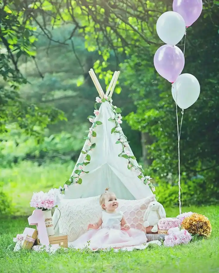 A small tent decorated with flowers and soft lighting creates a peaceful space for your baby’s special moment. Add a cute cake, favorite toys, and some balloons for color.