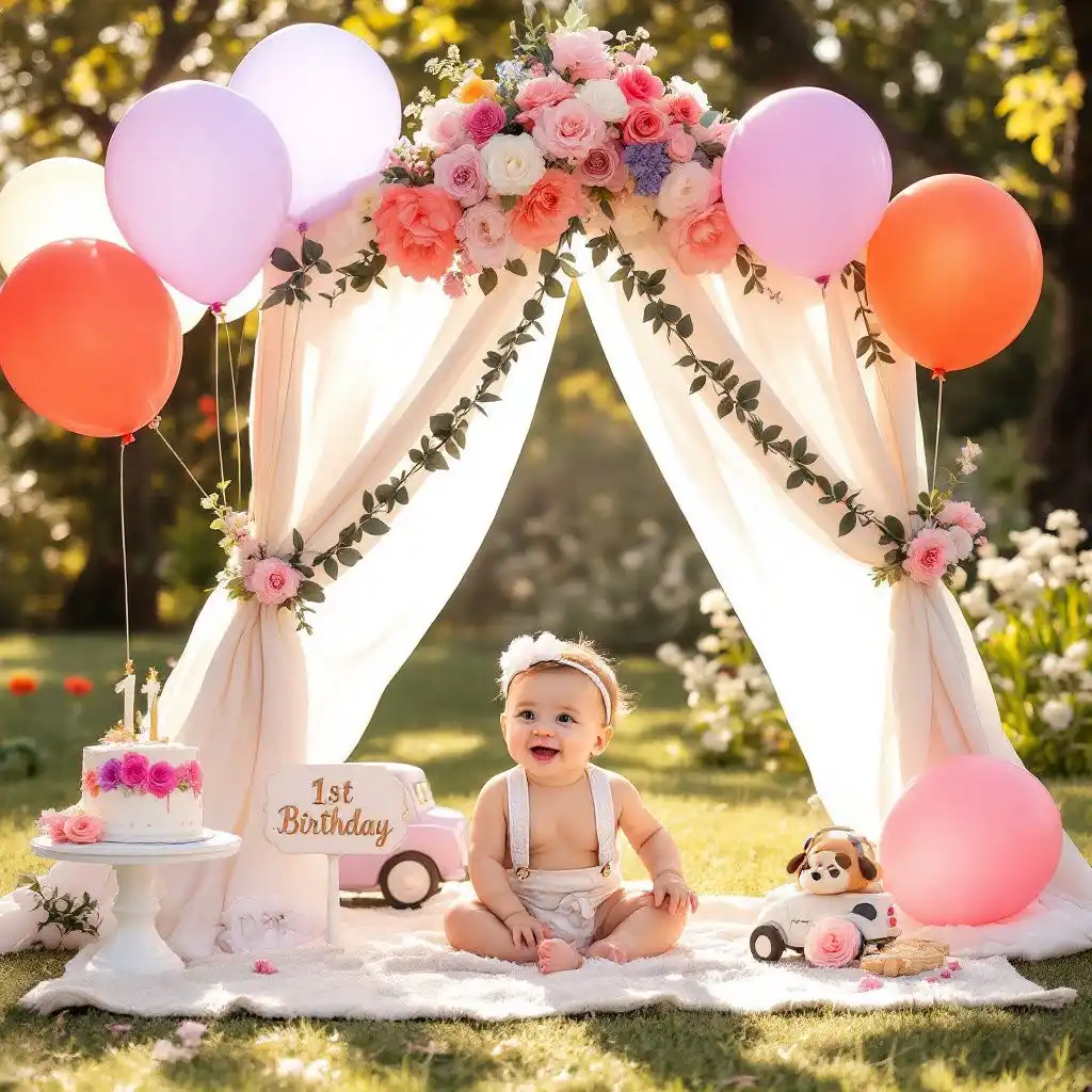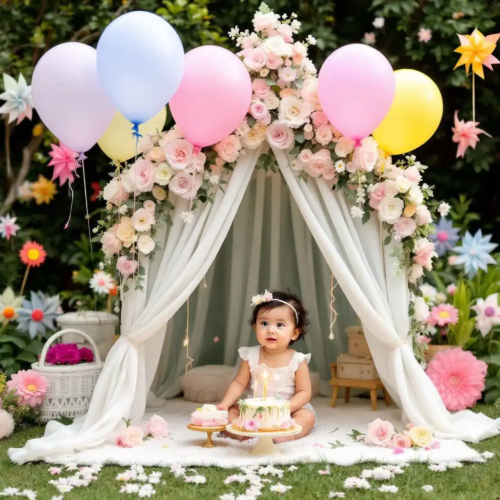 A floral tent setup instantly turns an ordinary backyard into a dreamy space. Soft drapes, pastel balloons, and fresh flowers create a magical feel that suits a first birthday perfectly.