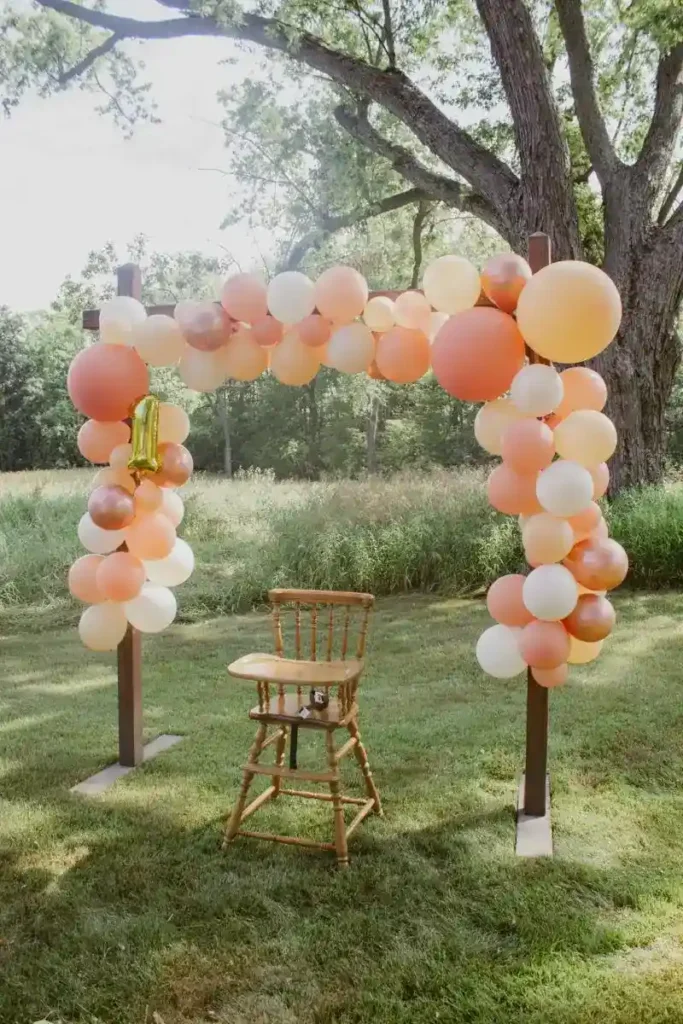 A balloon arch in soft peach and cream tones makes a cheerful backdrop for photos and cake time. Place a little chair or high seat under it and watch how beautifully it frames your baby’s first celebration.