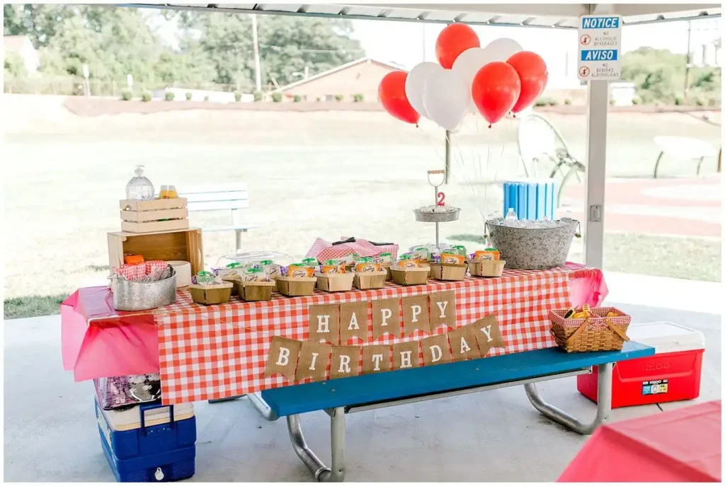 A picnic table with a checkered cloth and bright balloons gives a cheerful, casual vibe. Set out small snacks and drinks so everyone can grab a bite and relax.